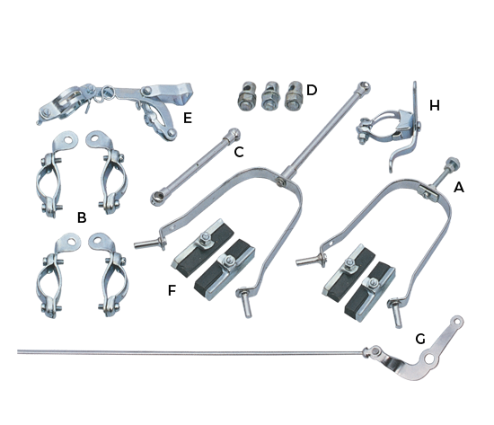 | (A) Stirrup Rear & Front (B) Clips Rear & Front (C)Tube (D) Button , (E) Leg Unit (F) Brake Shoe, (G) Wire, (H) Bottom Crank |